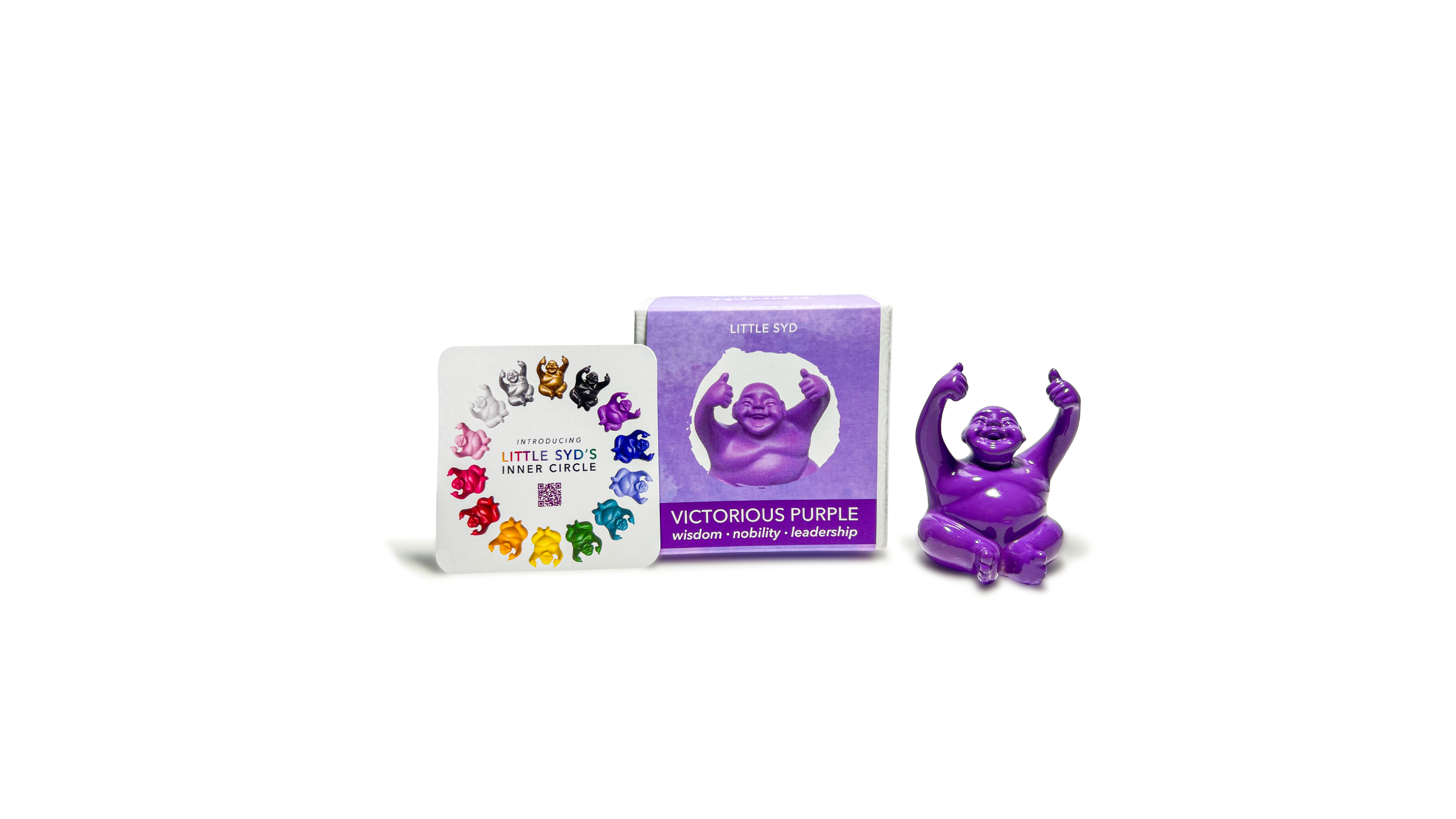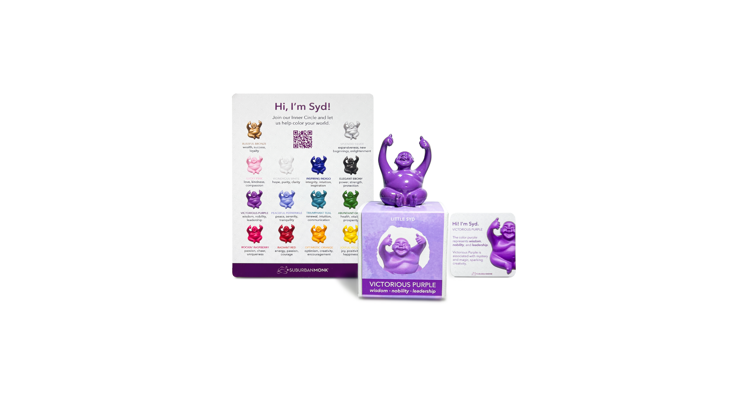 Our client, The Suburban Monk, had existing packaging and marketing materials that did not accurately reflect the positivity of their product offering, a happy thumbs-up monk statue named Little Syd. The client asked for a more modern, whimsical approach to their box packaging as well as redesigned marketing materials to match.
